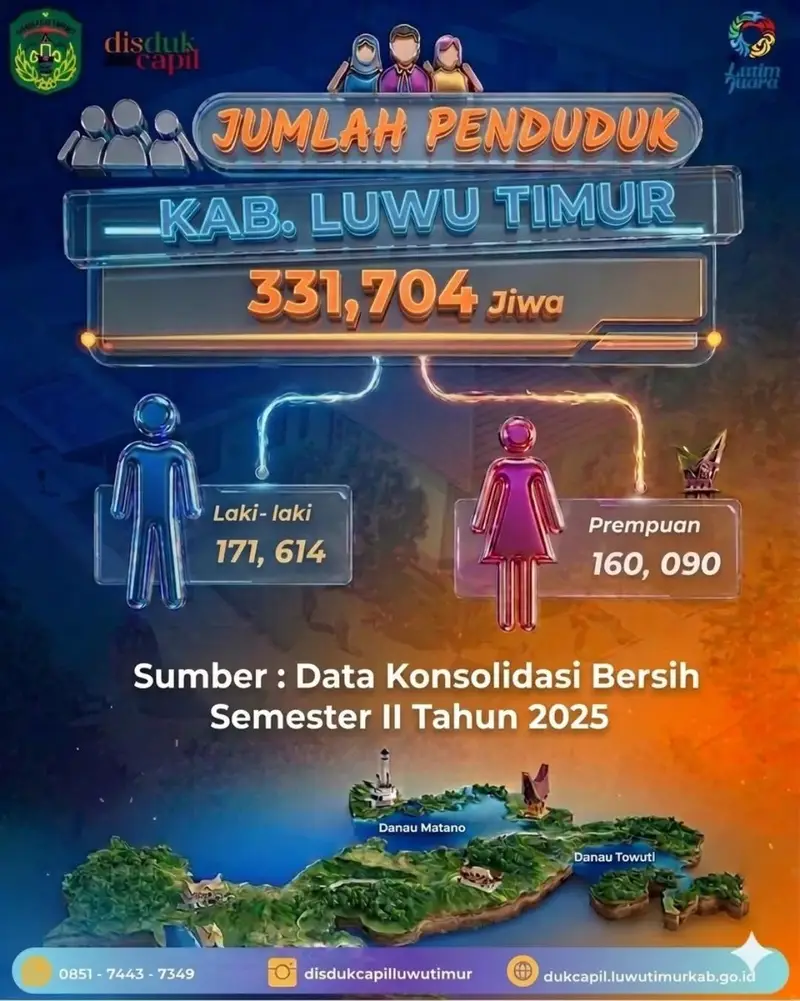 merekamindonesia.com – Dinas Kependudukan dan Pencatatan Sipil () merilis data terbaru jumlah penduduk Kabupaten Luwu Timur yang mencapai 331.704 jiwa. Data tersebut bersumber dari Data Konsolidasi Bersih (DKB) Semester II Tahun 2025 yang dipublikasikan pada 18 April 2026.