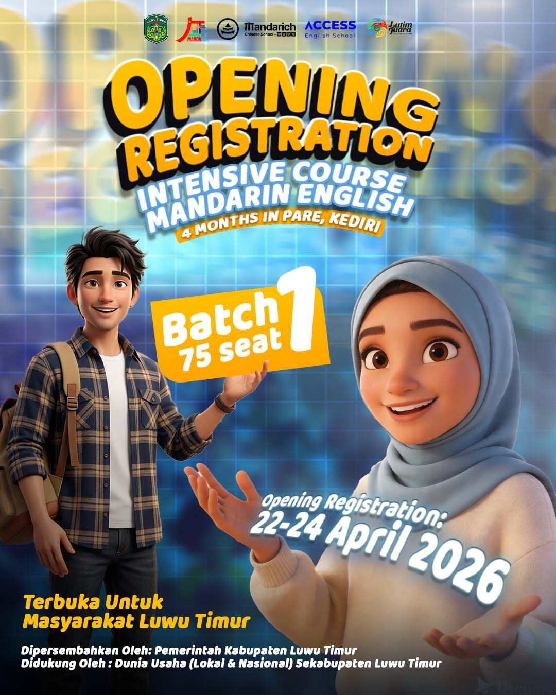 merekamindonesia.com – Pemerintah Kabupaten Luwu Timur segera membuka pendaftaran (open registration) batch pertama program unggulan Mandalish pada 22–24 April 2026. Program ini ditujukan bagi generasi muda yang ingin meningkatkan kapasitas diri, khususnya dalam penguasaan bahasa asing.