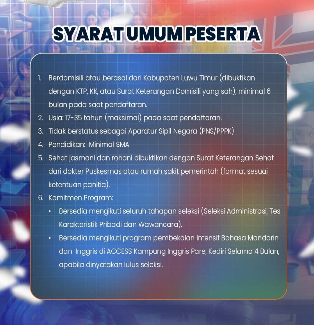 Menjelang pembukaan pendaftaran, panitia telah menetapkan sejumlah persyaratan umum bagi calon peserta. Peserta wajib berasal atau berdomisili di Kabupaten Luwu Timur, dibuktikan dengan dokumen resmi seperti KTP, Kartu Keluarga, atau surat keterangan domisili yang berlaku minimal enam bulan terakhir. Usia pendaftar dibatasi mulai 17 hingga maksimal 35 tahun.